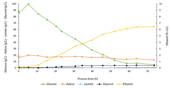 A strain engineered by VIB, Saccharomyces cerevisiae strain MDS130 [13,14], has been used. This strain is capable of efficiently fermenting both pentose (xylose) and hexose sugars in different agricultural waste streams. In the BioRen project, a 2G ethanol yeast strain has been developed from the MDS130 strain with a higher xylose fermentation performance. The strain engineering will be the subject of a different publication. The strains tested were capable of utilizing all the sugars within 20 h. After this point, a slight further increase of the ethanol production was observed due to the further release of sugars by the enzymes during fermentation. See Figure 3 for the results. This can give rise to yields higher than 100% (calculation based on initial fermentable sugars). In one example, an ethanol titer was obtained of 8.02% v/v corresponding to a yield of 104% after 24 h, and 8.6% with a yield of 111% after 48 h at 35.5 °C.