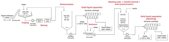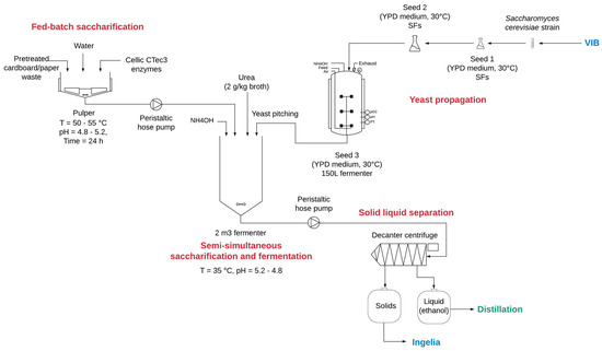 The majority of the bioethanol as green biofuels is produced using sugar and starch commodities, which gives rise to a debate: “food versus fuel”. Therefore, non-food-related raw materials such as agricultural waste (straw, corn stover), food residues and waste foresting are used for the production of cellulosic ethanol. Additional resources are available in waste streams (municipal solid waste and refuse-derived fuels). Especially, the organic fraction mainly consisting of paper/cardboard represents a valuable source for the production of cellulosic ethanol [1,2,3]. The objective of this paper is to highlight an efficient technology for the conversion of mainly paper/cardboard into bio-ethanol. The process involves a series of steps that includes separation and sorting, a thermal–chemical pretreatment and saccharification of cellulose/hemicellulose to a sugar solution, followed by fermentation to ethanol.