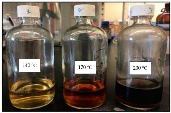 The extraction of lignin from the pine sawdust and pistachio shells was performed at 140 °C, 170 °C, and 200 °C using accelerated solvent extraction (ASE). The extraction yield from the pistachio shells was found to be 6.63% at 140 °C, 13.3% at 170 °C, and 15.78% at 200 °C. The extraction yield from the pine sawdust was found to be 6.52% at 140 °C, 14.4% at 170 °C, and 18.86% at 200 °C. The highest yield was achieved at 200 °C for 60 min for both the pine sawdust and pistachio shell biomass. Figure 2 shows the extraction of lignin from the pine sawdust biomass at different temperatures. The yield of the extracted lignin was calculated by using Equation (1). The extraction yield increases with the increasing temperature. Because organic solvents and sulfuric acid are used for the breakage of covalent bonds in lignocellulosic biomass at higher temperatures, the yield of lignin increases with temperature [29].