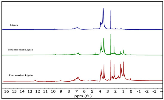 1H-NMR spectrum of extracted lignin from pine sawdust and pistachio shells compared with commercial lignin.
