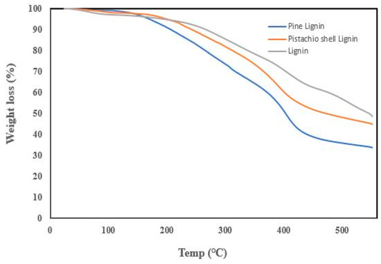 Thermogravimetric analysis was used to determine the thermal stability and decomposition temperature of the extracted lignin from the pine sawdust and pistachio shells. TGA measurements were taken using a Seiko TG/DTA220 instrument operating under nitrogen. Samples for each measurement were maintained at 14 ± 5 mg, and scans were performed from 25 to 560 °C at 10 °C/min to observe the thermal degradation and stability of each lignin based on its source. TGA curves reveal the weight loss percentage with respect to the temperature of thermal degradation. The lignin structure is composed of mostly aromatic rings having various branches, leading to a wide range of degradation temperatures from 100 to 560 °C. Figure 5 shows TGA curves for the pine sawdust, pistachio shells, and commercial lignin. Degradation of the lignin samples was divided into three stages. In stage one, the initial weight loss step occurred at 30–120 °C due to the evaporation of absorbed water. Stage two took place around 180–350 °C and is attributed to the degradation of carbohydrate components in the lignin samples. The final stage of the degradation occurred over a wide range of temperatures above 350 °C. During this stage, degraded volatile products derived from lignin, including phenolics and alcohols, are observed.