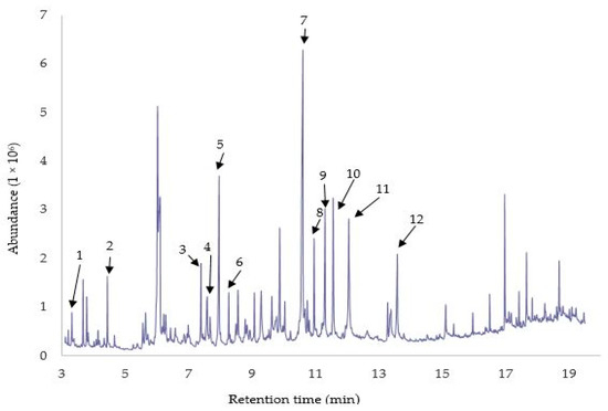 GC-MS total ion chromatogram of phenolic monomers from pine sawdust lignin.