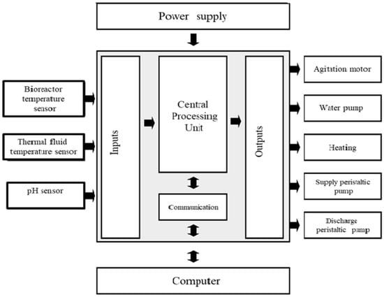 The control, monitoring and automation system chosen to create the biodigester was a Programmable Logic Controller (PLC) that communicates with a microcomputer through a supervisory software. This system was fully developed: hardware, firmware and supervisory software [18]. The designed hardware can be divided into four main parts: microcontroller—Central Processing Unit, input modules and sensor signal conditioning, output and power modules and communication between microcomputer-microcontroller. The conception of this hardware aimed to meet the following system needs: three analog inputs for temperature and pH sensors; five power actuators—for the electrical resistance manufactured by the company Dennex, model 29858, water pump manufactured Yimaker, model GDB390, digital stirring motor manufactured by Fisatom, model 713D, and 2 peristaltic pumps manufactured by Intilab, model OFA460—and the communication system between the microcomputer-microcontroller, as shown in Figure 2. In the part of the central processing unit, the PIC16f877a microcontroller from the manufacturer Microchip was used. This Programmable Integrated Circuit (PIC) was designed due to the fact that its characteristics meet all the needs pre-established in this project.