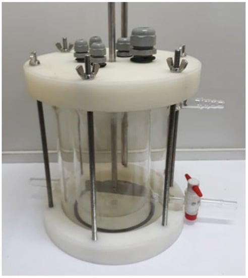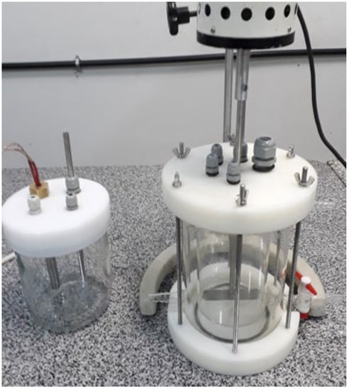 A scheme of test equipment, developed and used in this project, is represented in Figure 6, consisting of the jacketed vertical anaerobic biodigester, in bench and batch scale and in a single stage, which can be used in semi-continuous or batch system and is equipped with heating systems, mechanical agitation, collection and storage of biogas, and control, monitoring and automation.