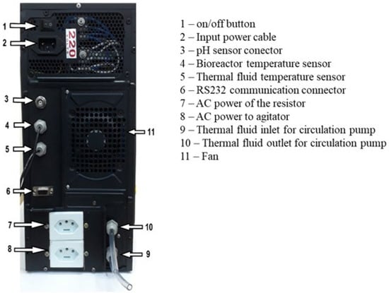 In the PLC inputs part, the analog signals coming from the sensors were previously conditioned in order to be in adequate conditions to be requested by the microcontroller. This conditioning was performed by means of an electronic low-pass filter in three PIC inputs (two for the bioreactor internal temperature sensors and for the heating tank and one for the pH). Two 10 K Ohm NTC (Negative Temperature Coefficient) temperature sensors were used to obtain the temperature values. The NTC Thermistor is a semiconductor that decreases its resistance value as the temperature increases and has a measurement range of −40 to 125 °C. The temperature sensors were calibrated using a thermal bath. The temperature of the bath was varied between 20 and +60 °C with an accuracy of ±0.1 °C. The polynomial equation obtained was saved in the supervisory software. PH monitoring was performed using a shielded, diffusion-type combined electrode produced by MSTecnopon Instrumentação. This pH probe presented the following specifications: measuring range from 0 to 14, operating temperature from 0 to 60 °C, reference system: Ag/AgCl, reference electrolyte: KCl 3M, Coaxial cable and BNC type connector. The calibration of the pH sensor was performed with pH 4 and 7 standard solutions and the calibration curve obtained was automatically saved by the supervisory software. Regarding the PLC output module, the different voltages (12VDC for the water pump and peristaltic pumps) and 220 Volts Alternating Current (VAC) for the heating element and the stirring motor) must be controlled at the output of the microcontroller, creating the need to design a drive system regardless of the load. The most viable option both economically and practically, was the load activation through a relay system. Five relays from the manufacturer ZND were used in this final system, model ZD-3FF-S-1Z-T, with five pins, operating voltage of 12VDC which allows the activation of loads up to 250VAC at 7 Amperes (A) or 14VDC at 12A. In the last part, the communication system that allowed the exchange of information between the microcontroller and the computer was carried out by means of an asynchronous serial communication, using an Integrated Circuit (IC) MAX232, whose function is to convert the voltage levels of TTL pattern (0–5VDC) from PIC microcontroller to RS-232 pattern (±12VDC) of the RS232 serial type communication port of the microcomputer (PC), and vice versa. The firmware was developed in the MikroC programming and compilation environment, from the company Mikroelektronika, using the C programming language and libraries—Analog to Digital Converter (ADC), Conversions and Universal Asynchronous Receiver/Transmitter (UART)—available in the compiler. These libraries have definitions for the analog/digital conversion and serial port functions that made programming easier. The recording of the program in the PIC microcontroller was performed using the PICkit2 tool together with the MPLAD IDE software from the manufacturer Microchip Technologies Inc. The Firmware was programmed to perform a sequence of functions in a cyclic way, called sweep cycle or scan. The scan time, i.e., the period of time in which the PLC performs this sequence of functions repetitively while in operating mode, was defined in this work in one second. In the initialization stage, the PLC runs tests on the hardware itself to ensure that the system is working properly and loads the process variables and their libraries. Then, the microcontroller receives information from the supervisor, initial conditions of the experiment or any changes made during the process. In the processing of readings, the values read by the temperature sensors and the pH probe are obtained. In the next step, the microcontroller stores in its memory the parameters from the supervisory software and the values read by the sensors. During the program execution process, the software performs the proportional temperature control procedure and defines the time for which the heating will be on. Therefore, the microcomputer updates its outputs (turning on, off or keeping the current state), the heating element, stirring motor, water pump and peristaltic pumps. Finally, the values read by the sensors and the current states of each actuator are sent to the supervisor, and then a new cycle begins. After assembling the hardware and programming and recording the firmware, several tests were carried out to verify the functioning of the developed PLC. The first test took place in the communication module, when a simple procedure was performed to send information from the computer to the PLC and a return message from the PLC to the computer and vice versa. This test could prove the efficiency of the communication system that was programmed in the software, as well as the physical connections made by the serial connection cable. Then, PLC inputs tests were performed analyzing the measurements made by the sensors. To carry out these tests, a program was developed, which performed the readings of the sensors connected to the PLC every second, and reported: the values of the last reading, the lowest and highest measured values, their average, the number of readings and the historic. It then became possible to analyze the operation of the analog inputs and to test the sensors in controlled temperature and pH environments. Regarding the output module, the actuators activation tests were carried out simultaneously with the supervisory software functioning tests. Finally, a metallic box was developed, with dimensions of 300 mm × 165 mm × 350 mm, called control unit, to accommodate the PLC, the power supplies, water pump and peristaltic valves used in the system for entrance and removal of material from the bioreactor.