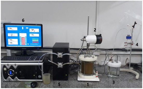 Operability and efficiency experiments in built biodigesters. (1) Bioreactor, (2) Stirring system, (3) Heating system, (4) Biogas collection and storage system, (5) control and automation unit and (6) Supervisory software.
