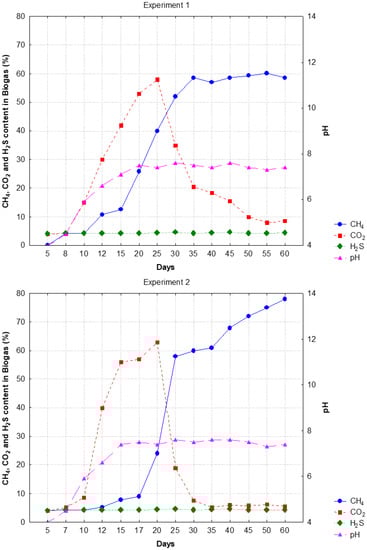At this stage, the objective was to test the biodigester and the efficiency of co-digestion for biogas production. Two experiments were carried out. Experiment 1 was performed in a batch system and experiment 2 in a semi-continuous system, both for 60 days. In both of them, a mixture of food waste, raw sewage without treatment and anaerobic sludge (inoculum) were used in the same proportions. Experiment 2 was fed every 10 days until the 60th day and in the feeding, 80% of the volume was removed and the same amount was added with food waste and raw sewage and experiment 1 was only fed at the beginning. The efficiency of the anaerobic co-digestion bioprocess showed, for experiment 1, low removal of volatile solids, compared to experiment 2, but with constant removal from the beginning. In experiment 1, there was removal of total and volatile solids of 52.5% TS and 60.4% TVS, and experiment 2 showed high removal of organic matter, expressed by the removal of 68.5% TS and 80.7% TVS. The average production rate and the total biogas volume produced in experiment 1 were respectively 0.4 L/day and 18.5 L, and in experiment 2, respectively, 1.5 L/day and 68.5 L. Srisowmeya et al. [21] evaluated that for processes carried out with USW and at mesophilic temperatures, it was possible to find volatile solids removals in the ranges of 71.6% with 24 days of experiment and in cases where there was recirculation, the removal can be optimized, reaching 80% in 12 days of experiment. The efficiency of methane production associated with pH variation in biogas production is shown in Figure 7. H2S behavior was similar for the two biodigesters.
