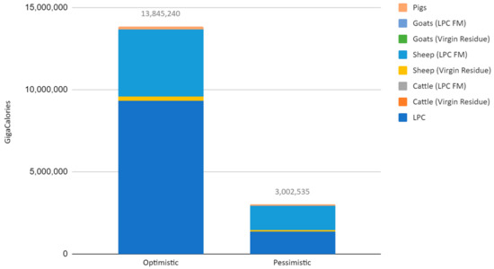3. Residues (tonnes) required to produce reported meat (tonnes) per livestock category from 1. was calculated used Equation (2) for both optimistic and pessimistic efficiency values (Table 3).