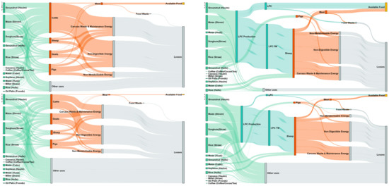 The analyses captured in the energy flow diagrams (Figure 4) reutilize LPC FM (hemicellulose and cellulose) and water-soluble calories left over from LPC extraction by feeding to ruminants/pigs. The nutritional quality of LPC FM was assumed to be sufficient to achieve an equivalent FCR to animals fed virgin residues. In reality, the nutritional value would be lower than for virgin residues, due to the bulk of crude protein and fat being extracted, along with some of the partially water-soluble carbohydrates. As ruminants can use energy stored as cellulose or hemicellulose, caloric requirements will likely be met; however, protein, fat and other key macronutrients, anticipated to be significantly lower post-processing, may become growth limiting. Future research conducted to determine the expected nutritional content of LPC FM produced from various crops via a specified method (the production method impacts the nutrient content of LPC FM) will allow an accurate account of total residue nutritional value to be determined. Feeding trials of animals on LPC FM diets would allow an accurate FCR to be determined, forming a base to investigate strategies to improve animal performance on LPC FM, such as combining LPC FM with various virgin residues or supplementing with ammonia.