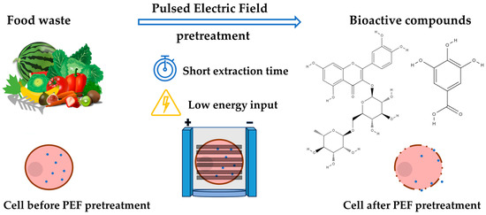 The management of food waste and by-products is of the utmost importance throughout the food supply chain. Sustainable strategies for food waste valorization can not only minimize pollution but also unlock the potential of bioactive compounds for various applications in the food industry, pharmaceuticals, and beyond. The introduction of non-thermal extraction techniques, particularly PEF-assisted extraction, offers a promising and environmentally friendly way to recover valuable bioactive compounds from food waste, paving the way for a more efficient and sustainable future in food processing. The role of mass transfer in extraction operations from solid food is crucial. The utilization of PEF in extraction techniques has been extensively discussed in the literature (vide infra), particularly in the context of liquid–solid extraction [45]. Over the course of the previous decade, a multitude of investigations have been conducted regarding the utilization of PEF for the extraction of bioactive compounds from food matrices. In contrast to prior investigations, the current study on PEF-assisted extraction primarily focuses on bioactive compounds stemming from food waste. The aim of this review is to bridge the gap between the quickly developing field of PEF technology and the critical need for application for sustainable food management. We will delve into the current state of PEF technology and its implications for recovering bioactive compounds from non-conventional sources in the food industry. By conducting an in-depth analysis of existing research, we aim to shed light on how the integration of innovative technologies like PEF into the food processing industry can play a pivotal role in sustainable practices by maximizing the recovery of bioactive compounds. In light of the urgent global demand for sustainable solutions in both food production and waste management, this review endeavors to provide a comprehensive perspective on the transformative capacity of PEF technology. Moreover, we intend to compare the PEF technique with other extraction techniques and evaluate whether PEF is a superior technique for the extraction of bioactive compounds from food by-products or not. In order to enhance clarity in the comparison, a classification based on by-products rather than bioactive compounds has been employed.