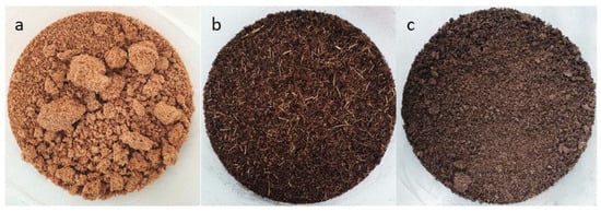 The visual changes caused by the pretreatments in the green coconut fibers are presented in Figure 1. It can be observed that, compared to the raw material (Figure 1a), the steam explosion (Figure 1b) darkened the fibers, with some long fibers remaining light brown. After the alkali pretreatment, the biomass turned completely dark, more homogeneously.