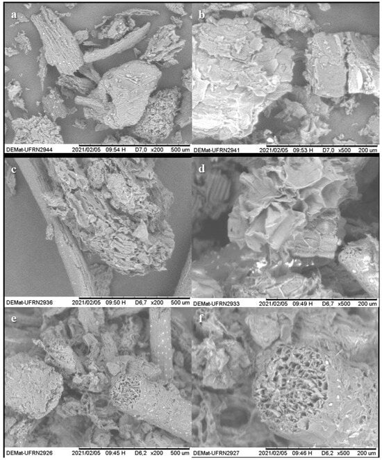 The surfaces of the raw and pretreated coconut fibers were observed using scanning electron microscopy (SEM), in a Hitachi TM3000 (Tokyo, Japan) microscope, with a focus on the areas of degradation of the fiber.