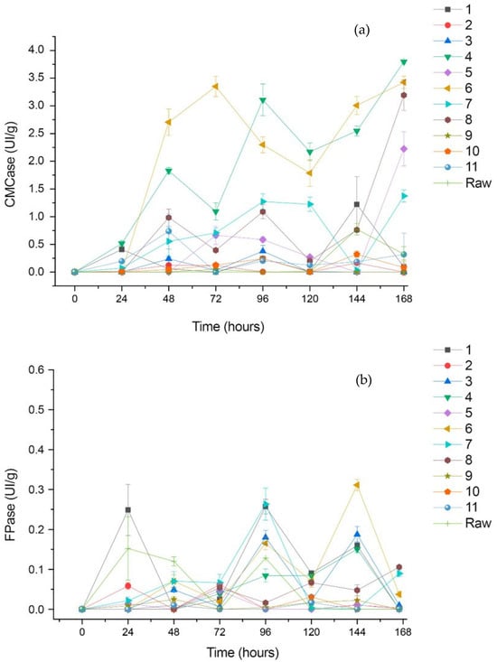 For the FPase production, an oscillating behavior was observed (Figure 3b). Some peaks were observed at 24 h (for run number 1 and the raw biomass), 96 h (runs 1, 3, 6, 7, and raw biomass), and 144 h (run 1, 3, 4, and 6). The maximum FPase activities registered (UI/g) were 0.31 ± 0.01 (run 6, 144 h), 0.26 ± 0.04 (run 7, 96 h), 0.24 ± 0.02 (run 1, 96 h), and 0.24 ± 0.06 (run 1, 24 h).