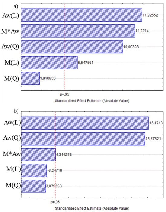 Considering runs #4 and #6 as the most promising conditions, as they yielded good CMCase results at 96 and 144 h, and their FPase activities peaked at 144 h, the sixth day was chosen as the best production day (144 h). An ANOVA was performed with the data related to this day, which are detailed in Table 4. The Pareto charts are presented in Figure 4, indicating the effect of the independent variables (water activity and mass of substrate) on the activities of CMCase (Figure 4a) and FPase (Figure 4b). For the CMCase, both the linear and quadratic terms of the water activity were statistically significant (confidence level at 95%). Additionally, the linear effect of the mass of substrate, and the synergic interaction between both independent variables were also significant. For the FPase, the linear and quadratic terms related to the water activity are significant, as well as the effect of the synergic term.