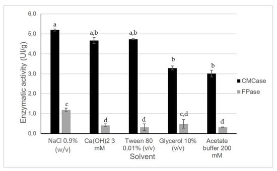 Pandey and Negi (2020) [52] highlighted how SSF for cellulase production investigations has focused on upstream operations. However, efficient recovery of the enzymes is essential for obtaining high cellulase yields. Therefore, four extraction solvents were chosen to be compared with the sodium acetate buffer previously used. They consist of aqueous solutions of sodium chloride (0.9% w/v); calcium hydroxide (3.0 mM); Tween 80 (0.01% v/v); and glycerol (10% v/v) all applied after 144 h of fermentation at the conditions of the run number 6. The CMCase and FPase activities recovered are presented in Figure 5.