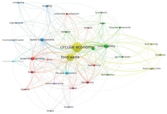 The yellow cluster consists of five keywords. Its theme is “circular economy of food”, as it covers many key issues related to food waste and the circular economy. Led by the two most important keywords, “food waste” and “circular economy”, the other keywords are “food loss”, “food security”, and “food chain supply”. The red cluster is “bioenergy”, which consists of nine keywords. This cluster focuses on the production of “bioenergy”, such as “biofuel” and “biogas”, in a “biorefinery” through “anaerobic digestion” of “biomass”. The “bioeconomy” is essential for “sustainable development”. The green cluster consists of eight keywords with the theme “waste valorization”. This cluster revolves around the “valorization” of “waste”, “agri-food waste”, and “by-products” through “fermentation”. It is also interested in extracting “bioactive compounds” and creating values from waste. The blue cluster is “waste management”, which consists of five keywords, including “waste management”, “municipal solid waste”, “recycling”, “composting”, and “organic waste”. These clusters represent research interests in the energy system transition to a more environmentally friendly direction. The theme of the purple clusters is “resource recovery”; the other keywords are “biochar” and “bioplastic”. The turquoise group has only two keywords, “environmental impact” and “life cycle assessment”, with the theme “environmental assessment”. While the above clustering results are generally consistent with the existing literature, e.g., [11,16,34], this study identifies a few topics, e.g., agri-food waste, resource recovery, and environmental impact, which are not mentioned by previous bibliometric studies on food waste.