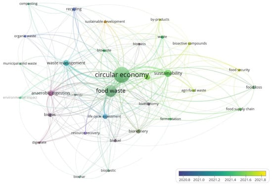 Based on the order of the average time of occurrence of the keywords, it is possible to understand the research trend in food waste and the circular economy (Figure 4). Purple or blue keywords appear first, followed by green, and more recently, yellow. Early research focused on “anaerobic digestion”, “organic waste”, “recycling”, and “resource recovery”. Subsequently, the focus of the study shifted to “waste management”, “waste”, “municipal solid waste”, “biowaste”, “composting”, “fermentation”, “biorefinery”, “bioplastic”, and “biochar”. The most recent research focuses on “sustainable development”, “food security”, “valorization”, “agri-food waste”, “bioactive compounds”, and “by-products”.