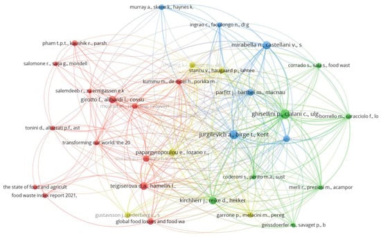 The network map of co-citation showing author clusters on food waste and the circular economy (2013–2024).