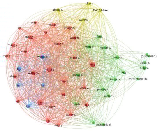 Using a minimum of 120 citations as the threshold for the authors’ co-citation analysis, 49 authors met the criteria and were divided into 4 clusters (Figure 6). The red group is the largest group, with 26 members, and is led by Zhang Y., Liu Y., Li Y., and Wang Y. The blue cluster consists of five authors, overlapping with the red cluster. The green color consists of 17 authors. Led by Sala S., who is an author of Mirabella et al. [44] (1st most cited paper) and Corrado and Sala [56] (18th most cited paper), the representative authors of the green cluster included Lin, C.S.K., Zhang Z., Liu G., and Pandey A. The yellow cluster consists of four authors, represented by Tsang D.C.W. (1st most productive author) and Ok Y.S. (11th most productive author).
