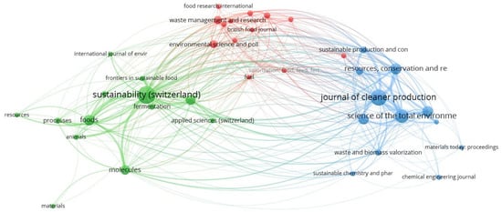 Using a minimum of 5 papers as the threshold for the bibliographic chance analysis of journals, 38 journals met the criteria and were divided into 3 clusters (Figure 7). The red cluster, consisting of 13 journals, is represented by Environmental Science and Pollution Research, Food Research International, British Food Journal, Food Waste Valorization, and Waste Management and Research. These journals cover various issues of “food and environmental sciences”, such as waste management, pollution research, food production, and food loss. The green cluster also consists of 13 journals with the theme “multi-disciplinary”. The represented journals are Sustainability (Switzerland), Foods, Molecules, Energies, Applied Sciences (Switzerland), Fermentation, Processes, Resources, and Animals. These are “open access” journals covering various topics in various scientific disciplines related to foods. The blue cluster comprises 12 journals entitled “environmental sustainability and resource management”. The represented journals are the Journal of Cleaner Production, Science of the Total Environment, Resources, Conservation and Recycling, Bioresource Technology, Waste Management, and Sustainable Production and Consumption. These journals publish interdisciplinary research on food waste and the circular economy from a global perspective.