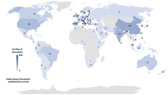 From 2014 to 2023, 87 countries had published papers on food waste and the circular economy (Figure 8). The country with the highest number of publications was Italy (226 papers), followed by the United Kingdom (115 papers), China (89 papers), Spain (81 papers), India (79 papers), and the United States (60 papers). The rest of the countries had published less than 60 papers.