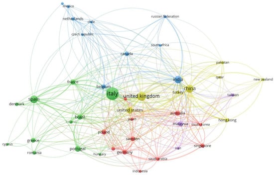 The network map of co-authorship, showing clusters of countries on food waste and the circular economy (2014–2023).