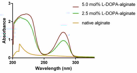 3.1. Modification of Alginate with L-DOPA and Its Characterization