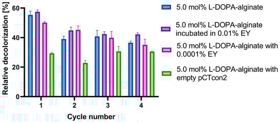 3.5. Photopolymerization of L-DOPA-Alginate Beads with Immobilized Cell Wall Laccase