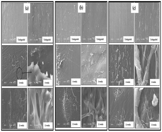 SEM images before and after biodegradation at 0, 4, and 11 weeks: (a) 100PBS, (b) 70PP*−30PBS−0C, (c) 70PP* 30PBS 1C, (d) 70PP*−30PBS-2C, and (e) 70PP*−30PBS-5C. Images on the left are acquired with ×100 magnification and on the right with ×3000 magnification.
