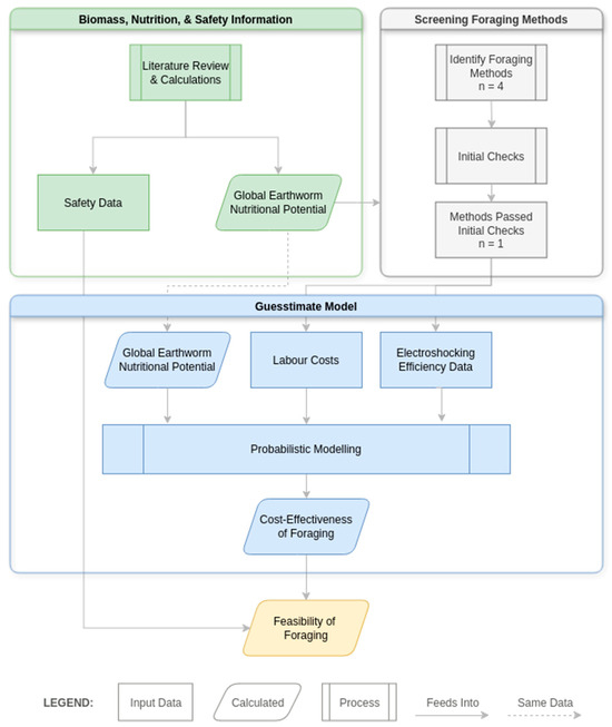 The methodology for this study can be broken down into three main interlinked sections: work on biomass, nutrition, and safety information; screening foraging methods; and the Guesstimate model (Figure 1). Firstly, in order to know the total earthworm biomass, what nutrition it can provide, and whether large amounts are safe to eat, a literature review was required to gather published data, and basic calculations were necessary to answer the research questions (points 1 and 2 from the introduction). Secondly, we identified foraging methods by reading the literature, media reports, and web pages before screening them for suitability for large-scale foraging, narrowing down four identified methods to one (point 3 from the introduction). This screening involved logical considerations and Fermi estimates to gauge feasibility. Lastly, a Guesstimate model was generated to probabilistically analyse the cost-effectiveness of foraging, taking in findings from the previous two sections and additional estimates of labour and electroshocking efficiency (point 4 from the introduction). All of the results from these three sections, along with analysis of general practicality and safety considerations, fed into the final output of profiling the feasibility of earthworm foraging (point 5 from the introduction). Full calculation details are provided in the Supplementary Materials (Table S1) for all work except the Guesstimate model, which is publicly available online [18].