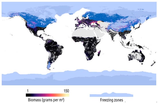 Overlap of global earthworm distribution and nuclear winter freezing zones. Earthworm biomass is displayed, overlaid with frozen land areas (temperature < 0 °C), shaded in blue. Frozen land area is based on predicted average surface temperature for June, July, and August following a 150 Tg nuclear conflict in the Northern Hemisphere in the month of May. Adapted from [19,72].