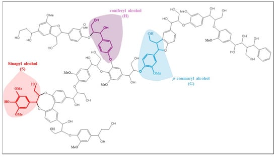 Lignin, being the second most abundant natural biopolymer on Earth, constitutes about 15–30% of the total lignocellulosic biomass of plants and trees [1,2]. Lignin is the most abundant non-carbohydrate component that imparts rigidity and hydrophobicity to the plant cell wall [3]. It possesses a complex aromatic heteropolymer structure and strong binding to cellulose and hemicellulose [4,5]. These properties position lignin as the principal contributor to lignocellulose recalcitrance. Structurally, lignin is an amorphous polymer composed of oxygenated p-propyl phenol units, such as syringyl (S), guaiacyl (G), and p-hydrophenyl (H), that form a complex three-dimensional (3D) network. These polymers are produced as a result of the linkage of ester bonds of the monolingols, a class of three basic building blocks of alcohols, i.e., p-courmaryl, coniferyl, and sinapyl alcohols [6]. Figure 1 shows the complex structure of lignin, highlighting its heterogeneous nature and strong interactions with other biomass components in plant cell walls. Understanding these interactions can unlock the potential for lignin characterization, improved bioconversion technologies, and novel applications. Within the bioeconomy, lignin’s potential pivots on its key building blocks, monolignols. These phenylpropanoid molecules (coniferyl, p-coumaryl, and sinapyl alcohol) share a core structure with aromatic rings. These aromatic rings are essential for forming strong bonds during lignin polymerization, leading to its strength and stability [7,8], as shown in Figure 2. By probing into monolignol structures, particularly the aromatic rings, researchers unlock doors to improved lignin characterization, enabling targeted modifications and, ultimately, the development of novel bio-based applications for a more sustainable future.