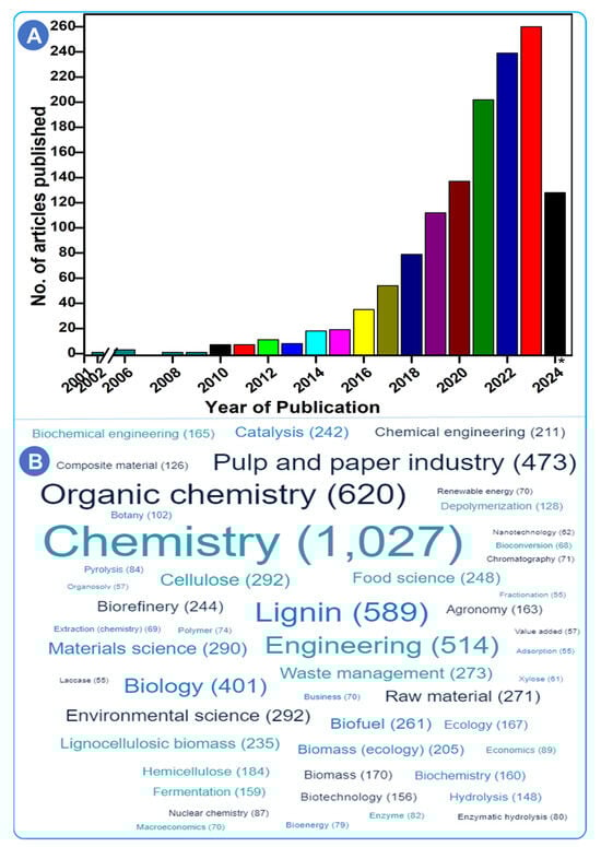 Total number of articles published from 2000 to 20 June 2024 (A). A word-cloud analysis of the lignin valorization representing the most frequent fields of study (B). The data were sourced from the PubMed and Scopus databases using search items “Lignin valorization”, “Lignin biorefinery”, “Value-added products from lignin”, and “Bioplastics “in the title, abstract, or author keywords of the publications.