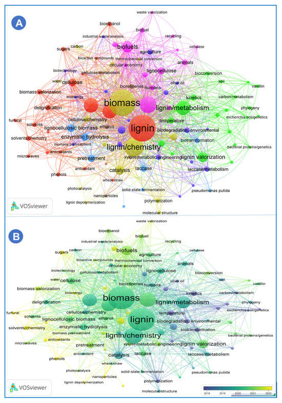 Co-occurrence network analysis of author keywords with a word frequency of more than five times. The data come from a literature search with characterization and valorization of lignin using the full counting method. (A) The collaboration analysis of Lignin and its valorization strategies for value-added products. (B) The density visualization of lignin depicted by the full counting method highlights the latest developments in the research area.