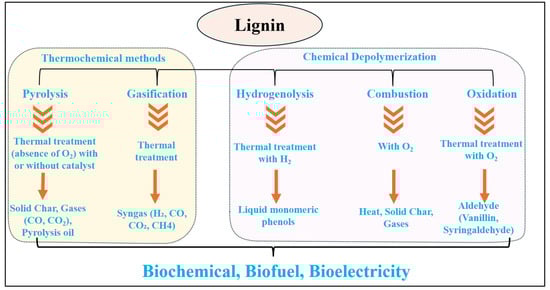 Thermal depolymerization techniques, namely pyrolysis, gasification, and hydrothermal liquefaction, are employed to break down the resilient lignin polymer into diverse products. Pyrolysis involves subjecting lignin to high temperatures (typically 400–800 °C) in the absence of oxygen, resulting in the formation of monomeric and oligomeric phenols present in liquid oil (e.g., phenol, catechol, syringol, guaiacol), volatile compounds (e.g., methanol, acetone), gaseous substances (H2, CO2, CH4, C2H4), and biochar [72,73]. Gasification, on the other hand, occurs at extremely high temperatures (>800 °C) in the presence of an oxidizing agent such as air or oxygen, leading to the production of synthesis gas (syngas) primarily composed of H2, CO, CO2, and CH4 [72]. Hydrothermal liquefaction (HTL) involves treating lignin at moderate temperatures (200–400 °C) and high pressure (5–28 MPa) in a solvent like water, yielding low-oxygen liquid bio-oil and/or phenolics such as syringol, vanillin, guaiacol, along with phenolic oligomers [72,73,74]. These thermal depolymerization techniques effectively cleave the robust bonds within lignin, resulting in the generation of valuable phenolic monomers, dimers, oligomers, aromatic hydrocarbons, and char. The distribution of products is influenced by factors including the source of lignin, temperature, pressure, and residence time [72,74]. Analyzing the depolymerization methods (thermochemical and chemical) and product utilization pathways (biochemicals, biofuels, bioelectricity) presented in Figure 5 offers valuable insights into future advancements in lignin conversion. Consulting recent literature on these areas will be critical for identifying promising strategies to enhance lignin’s value in bioconversion processes. This knowledge can pave the way for the development of next-generation methods, ultimately maximizing lignin’s potential within a sustainable bio-based economy.