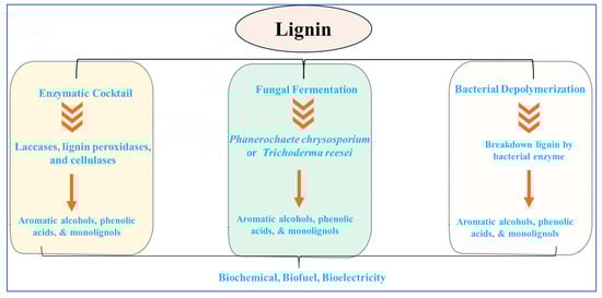 The use of these enzymes, coupled with the mild conditions and enzymatic specificity of biological processes, enables the effective breakdown of lignin into valuable compounds [95,96]. Enhancing lignin depolymerization efficiency can be achieved by combining enzymes like aryl alcohol oxidase and lignin peroxidase in biocompatible ionic liquids [97]. Figure 7 depicts biological depolymerization for lignin valorization. Analyzing this alongside advancements in enzymes, microbes, and process optimization can guide research toward efficient, sustainable methods, maximizing product yield and bioenergy potential, ultimately unlocking lignin’s value in a bio-based economy. Furthermore, researchers are exploring eco-friendly approaches using microbes like fungi and bacteria. Processes like PIPOL demonstrate the promise of these microbes in efficiently breaking down and converting lignin [2,23,116].
