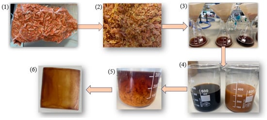 Cutin extraction process: (1) tomato processing by-product, (2) dry tomato peels, (3) filtration of extract, (4) pH shift, (5) cutin that participated out of solution, and (6) cutin-coated bioplastic.