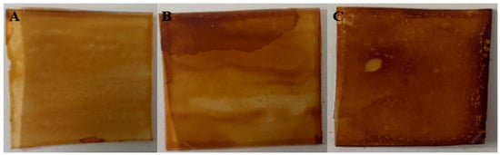 Bioplastic coated with cutin coating by different techniques: (A) brushing, (B) rolling, and (C) dipping.