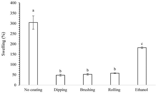 Percentage swelling of coated and uncoated bioplastic samples (n = 3). Values represent averages and error bars represent standard deviation. Different subscript letters denote statistical differences.