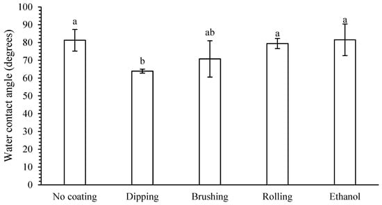 The water contact angle did not manifest as expected. The contact angles of samples, with or without cutin deposited on the surface, were all hydrophobic (<90°). There was no statistically significant difference between the treatments as no relevant change in the hydrophobicity was detected (Figure 5). More interestingly, it was found that the dip-coating method caused a decrease in the contact angle, making the samples even more hydrophilic.
