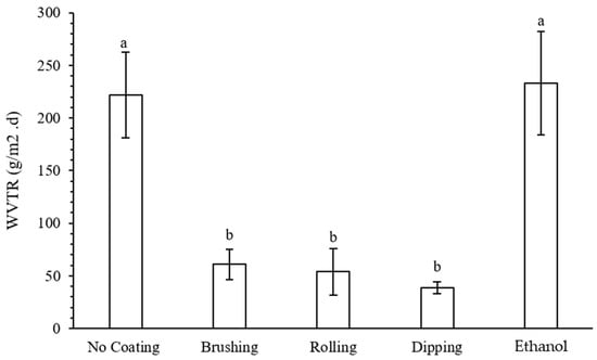 The bioplastics with and without the cutin were assessed for their water vapour transmission rates (Figure 6). The control bioplastic with no cutin treatment was found to have a water vapour transmission rate of 222.03 ± 40.75 g/m2day. Another control was set up with just an ethanol treatment and had WVTR of 233.0917 ± 48.87 g/m2day; the ethanol treatment increased the WVPR by 5% in comparison to the non-coated control. The three bioplastics with the cutin, applied by either brushing, rolling, or dipping, had water vapour transmission rates of 60.88 ± 14.32 g/m2day, 53.77 ± 22.15 g/m2day, and 38.64 ± 5.8 g/m2day, respectively. These were significantly lower than the rate in the non-coated control and resulted in a 73 to 83% decrease in the WVPR in comparison to the non-coated control. The samples with cutin incorporated into the bioplastic and bioplastics directly treated with ethanol and the non-coated sample were not statistically significantly different from each other. The previously reported water vapour transmission rates of other bioplastic materials were 103–195.1 g/m2day for PLA (Polylactic acid) [] and 73–82 g/m2day for starch–gelatine-blend films []. This demonstrates that the water-permeability values of the bioplastics coated with cutin were lower than those of PLA and starch–gelatine blends. The water vapour transmission rate appears to be linked to film thickness (mesoporosity), but this relationship was not addressed in this study.