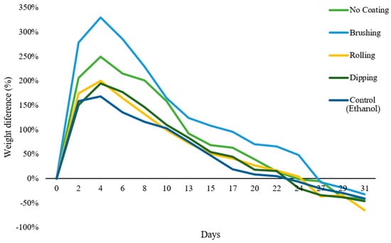 Over the initial 72–96 h, the absorption of water occurred at different rates. In addition, the application of the cutin surface treatment did not significantly impact the overall time of bioplastic biodegradation. All of the bioplastics, with or without cutin coating, started to degrade after 96 h (day four) and weight loss (relative to original weight) occurred between days twenty-two and twenty-seven. There was no statistically significant difference between all treatments, and on the first day, a decrease in weight was noted for each treatment; the p value = 0.88 at a 95% confidence level. Moreover, all bioplastics were physically too small to retrieve after thirty days or less of burial. There was no statistically significant difference in weight loss between any of the treatments after 31 days of the test; the p value = 0.21 at a 95% confidence level. This degradation time is very promising for home composting bioplastics, which are expected to be visually degraded within ninety days (Neves et al., 2020) [].