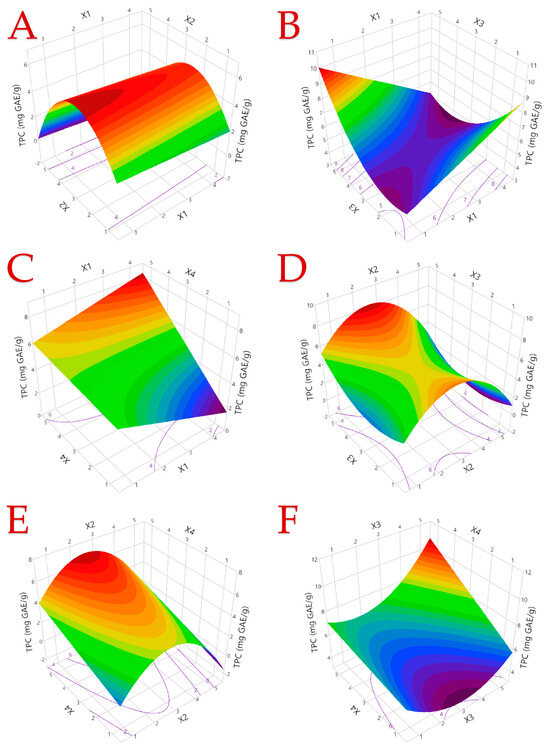 The optimal extraction of the carrot peels is depicted in 3D graphs, illustrating the effects of the process variables on the response, specifically the TPC. Plot (A) displays the covariation of X1 and X2; plot (B) displays the covariation of X1 and X3; plot (C) represents the covariation of X1 and X4; plot (D) demonstrates the covariation of X2 and X3; plot (E), exhibits the covariation of X2 and X4; plot (F) reveals the covariation of X3 and X4.