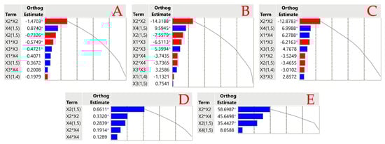 The evaluation of the Main Effects and their interactions with each extraction parameter was done using Pareto plots, with a significance level of p < 0.05 for statistical analysis. Figure 2 shows the effect of the independent factors on bioactive molecules and antioxidant activity, which include technique (X1), solvent concentration (X2), extraction duration (X3), and extraction temperature (X4). The orthogonality-applying technique also yields the orthogonal coded estimates, which are also displayed. Based on the results of the Pareto plot, one could deduce that among the extraction parameters, X2 was deemed undesirable for TPC and antioxidant assays. An answer to this could be a strong correlation between the isolated polyphenols and the antioxidant capacity. Specifically, the X2 × X2 combination showed that these variables negatively affected elevated ethanol concentration in water, indicating that TPC recovery is quite sensitive to these changes. However, this independent factor had a high positive impact on the recovery of ascorbic acid and total carotenoids. This trend could be a matter of bioactive compounds polarity, wherein polyphenols could demand a more polar solvent compared to ascorbic acid and carotenoids. A negative effect of the X3 and X4 factors in combination was also noted in these tests. Bioactive chemicals may degrade when exposed to high temperatures and long periods. Figure 2A further showed that the temperature of extraction, when considered independently, did not significantly impact. In comparison to the other two independent factors, X3 had a negligible effect on the recovery of bioactive compounds, but it did have a slight effect on the recovery of polyphenols, as previously mentioned. Nevertheless, More et al. [31] stated that elevated temperature value can solubilize bioactive molecules and improve their recovery, as evidenced by the substantial positive impact observed in all assays concerning factor X4.
