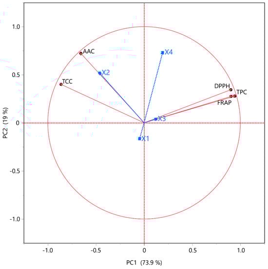 The PLS model was used to estimate the impact of the extraction condition parameters (X1, X2, X3, and X4). As such, Figure 4 illustrates a correlation loading plot of this model. Such research on carrot peels revealed the impact of extraction conditions, wherein the authors expected to maximize extraction efficiency. Conditions that significantly affect the extraction of molecules with biological activity include temperature, solvent composition, and extraction period [41], in addition to the extraction technique [42]. Regarding variable X2 which was the matter of most bioactive compound recovery, maximum responses in most assays were seen at level 4 (i.e., 75% v/v ethanol), indicating that the specific variable played a significant role. In terms of extraction methods, it was found that bioactive chemicals could be recovered satisfactorily with the sole ST technique, where a different pattern from that of our previous work [14] on apple peels, valorization was found. A thorough examination using partial least squares was necessary to guarantee the effect of extraction duration with respect to the extraction duration parameter (X3), as AAC and TCC recovery seemed independent of this parameter. This led to the selection of a high extraction duration (i.e., 150 min) since the other variables (i.e., TPC, FRAP, and DPPH) required so. Lastly, the widely recognized behavior of molecules that are readily solubilized and extracted at high temperatures was once again demonstrated, despite the negative correlation of the DPPH assay. As a result, the optimal temperature variable (X4) was determined to be 80 °C.