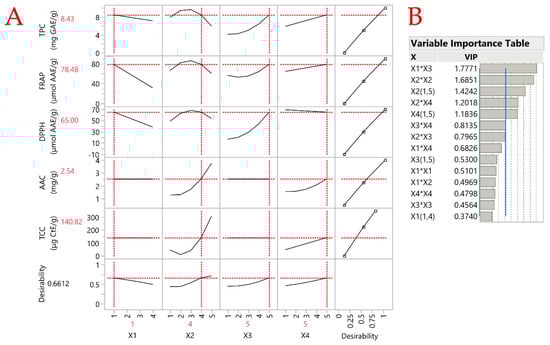 The desirability function illustrated with extrapolation control and partial least squares (PLS) prediction profiler for optimizing the carrot peel extracts is depicted in Plot (A). Plot (B) displays the variable importance plot (VIP) option values for each predictor variable. A blue dashed line at the 0.8 mark on the VIT indicates each variable’s significance level.