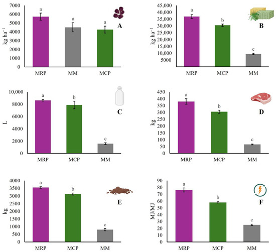 Milk and meat production showed differences among the treatments (p < 0.05, Figure 1C,D). A monoculture-based system (MM) generated an average production of 66.7 kg of meat and 1574.1 L of milk, while the highly integrated systems (MRP and MCP) generated an average increase of 275.5 kg and 6677.7 L more of meat and milk, respectively (Figure 1C,D).