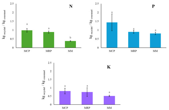 The integration level treatments showed differences in the Nitrogen Recycling Index (RIN) (p = 0.002, Figure 2), with MCP having the highest nutrient recycling index of the group (RIN = 0.99, RIP = 1.44, RIK = 0.81). In contrast, MRP only recycled 0.89 kg of nitrogen, 0.9 kg of phosphorus, and 0.75 kg of potassium for each kilogram of nutrient consumed, while the MM system recycled 0.38, 0.81, and 0.52 kg of nitrogen, phosphorus, and potassium, respectively (Figure 2).