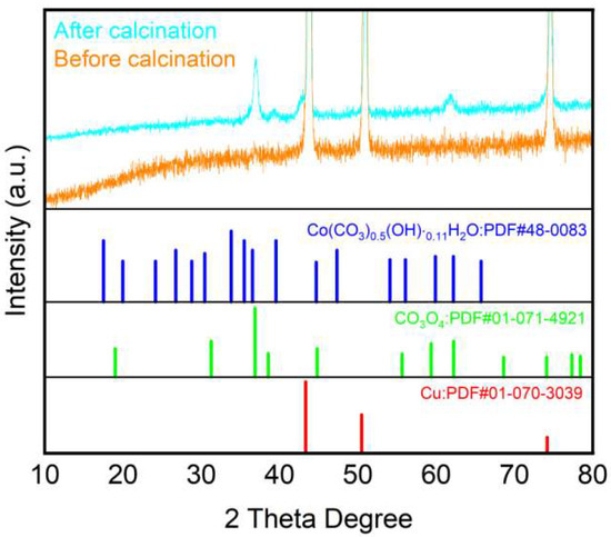 In the electrolysis experiment, six catalytic electrode samples were synthesized, all supported on pretreated foam copper (CuF). The precursors included cobalt nitrate hexahydrate [Co(NO3)2·6H2O], iron nitrate nonahydrate [Fe(NO3)3·9H2O], and nickel nitrate hexahydrate [Ni(NO3)2·6H2O]. Through sequential hydrothermal reaction and muffle furnace calcination, the following catalysts were obtained: Co2(CO3)(OH)2/CuF, Co3O4/CuF, Fe6(CO3)(OH)12/CuF, Fe3O4/CuF, Ni(OH)2/CuF, and NiO/CuF. X-ray diffraction (XRD) analysis was first conducted on all six catalysts to investigate their crystalline structures. For the synthesized cobalt-based electrocatalyst, as shown in Figure 4, characteristic peaks at 2θ = 43.3°, 50.4°, and 74.1° correspond to the (111), (200), and (220) diffraction planes of metallic copper (Cu), respectively (standard reference card PDF#00-004-0836), confirming the preservation of the foam copper substrate’s crystalline structure during both hydrothermal synthesis and calcination. Although the XRD spectra exhibited limited resolution, the pattern of the sample on the foam copper substrate after hydrothermal synthesis but prior to calcination aligns with the diffraction planes of Co2(CO3)(OH)2 (standard reference card PDF#48-0083). Following calcination, distinct peaks at 31.3°, 36.9°, 38.5°, 44.8°, and 65.2° in the XRD spectrum correspond to the (220), (311), (222), (400), and (440) planes of Co3O4 (standard reference card PDF#01-071-4921), demonstrating the successful conversion of Co2(CO3)(OH)2 to Co3O4 during the calcination process.