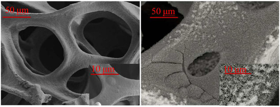 SEM images of foam copper (unmodified) and Co3O4-loaded foam copper at 50 μm and 10 μm magnifications.